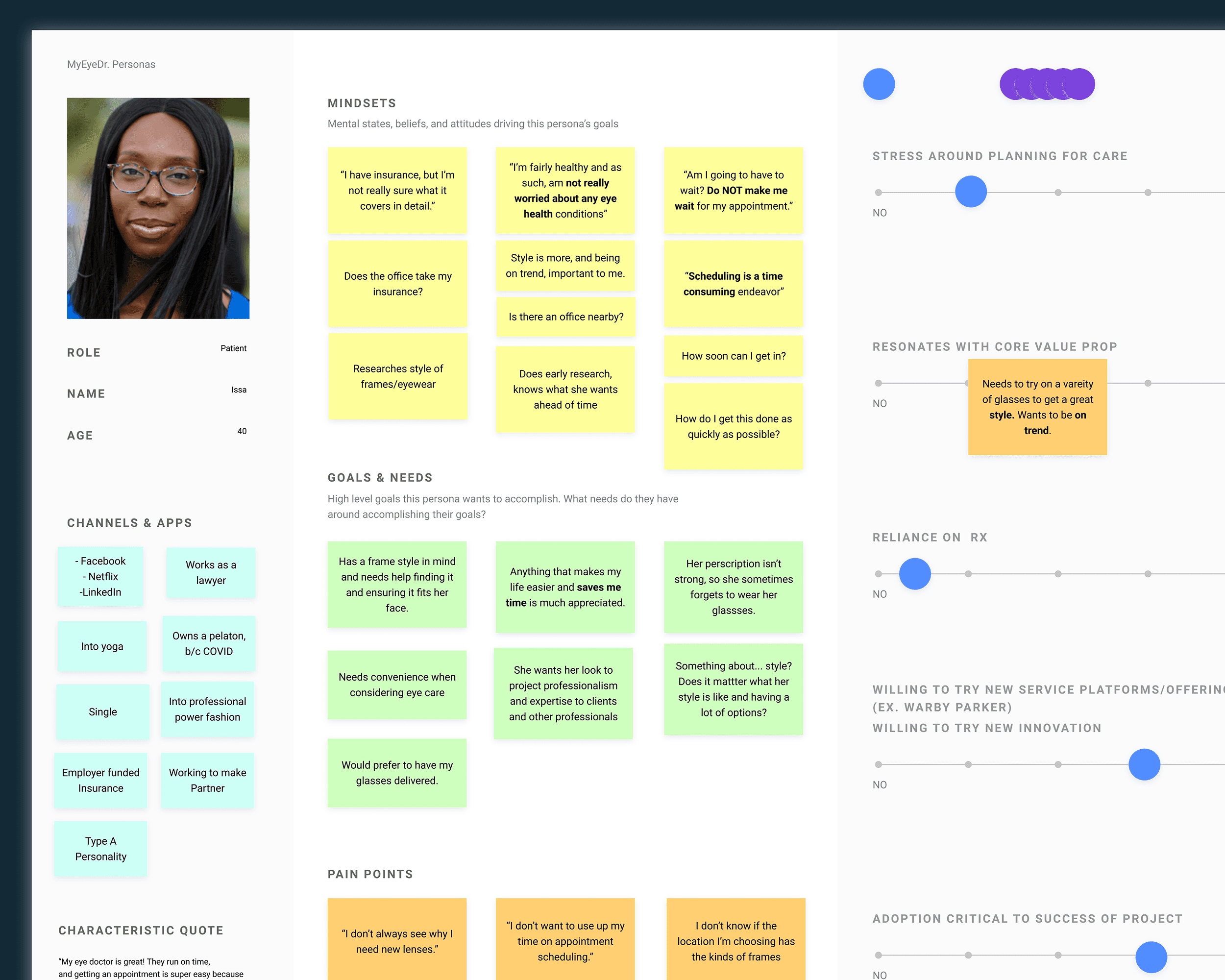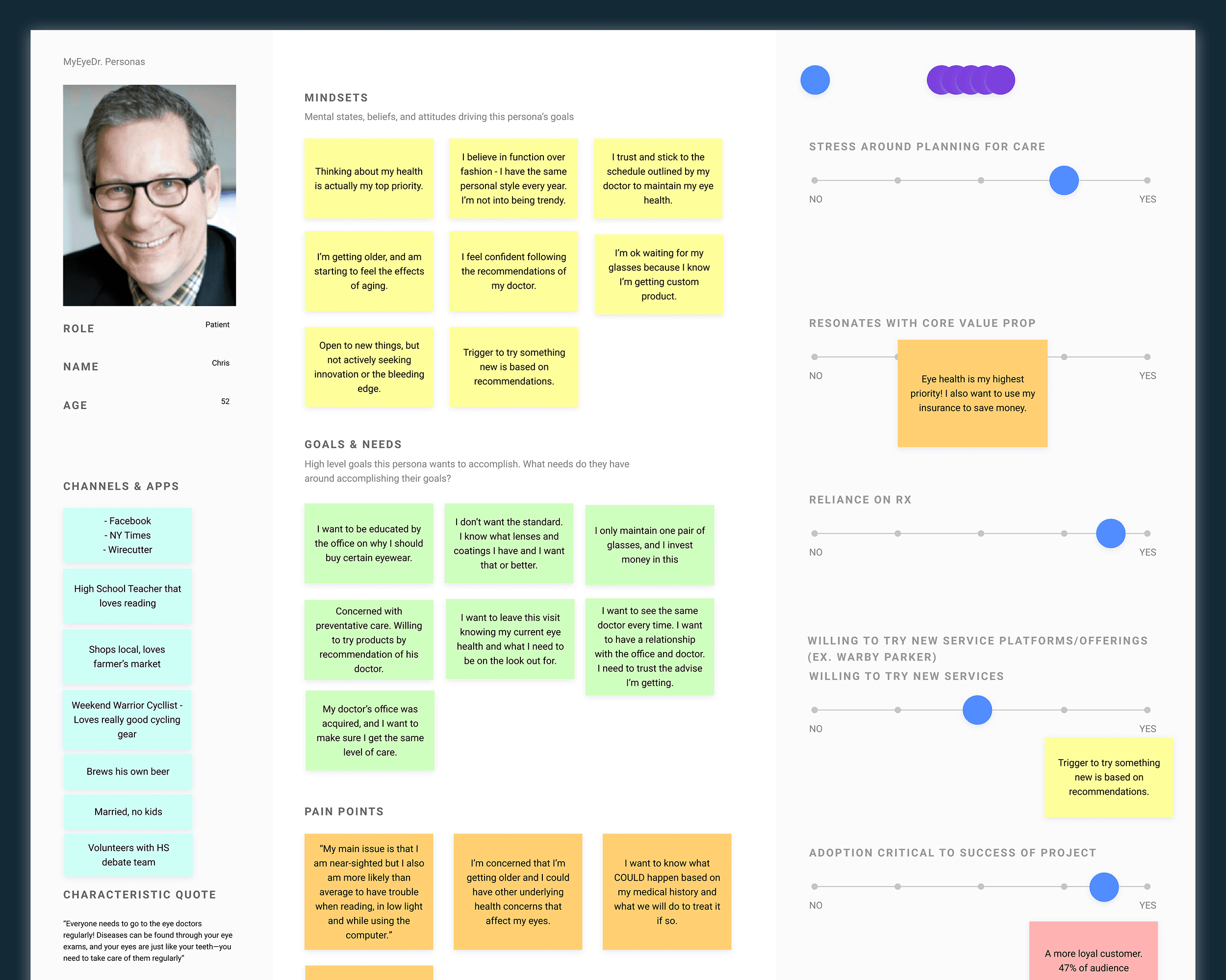 MyEyeDr entered the project with prior research conducted by McKinsey. While valuable, the findings skewed toward high-level marketing insights rather than actionable product behavior. These insights were restructured to support persona development and flow-level decision-making.